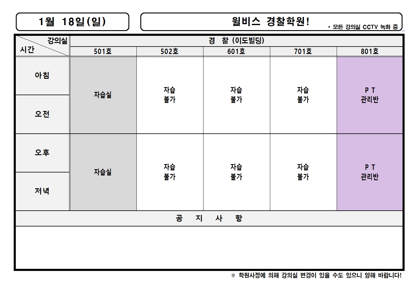 1월 18일(일) 강의실배정표