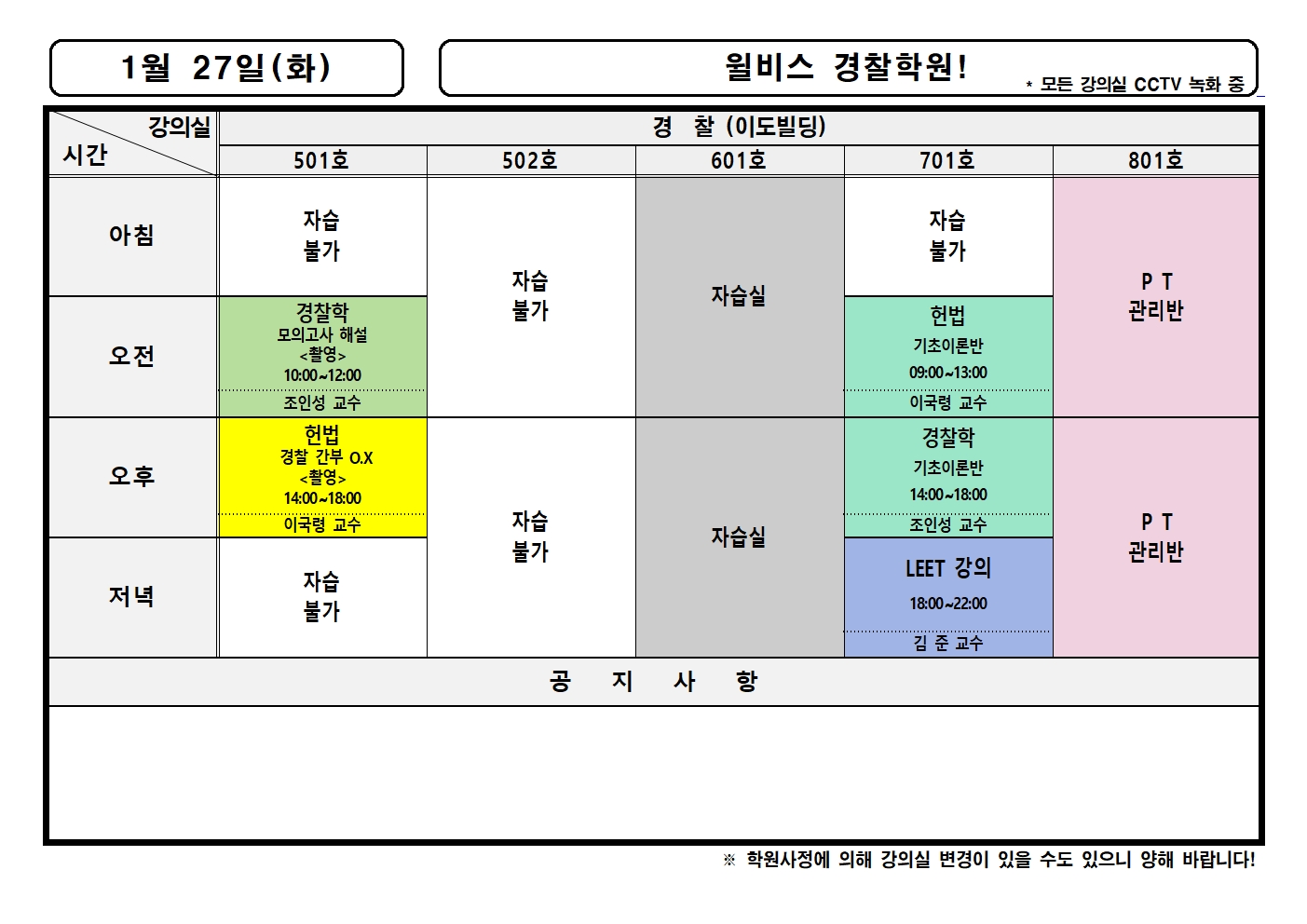 1월 27일(화) 강의실배정표