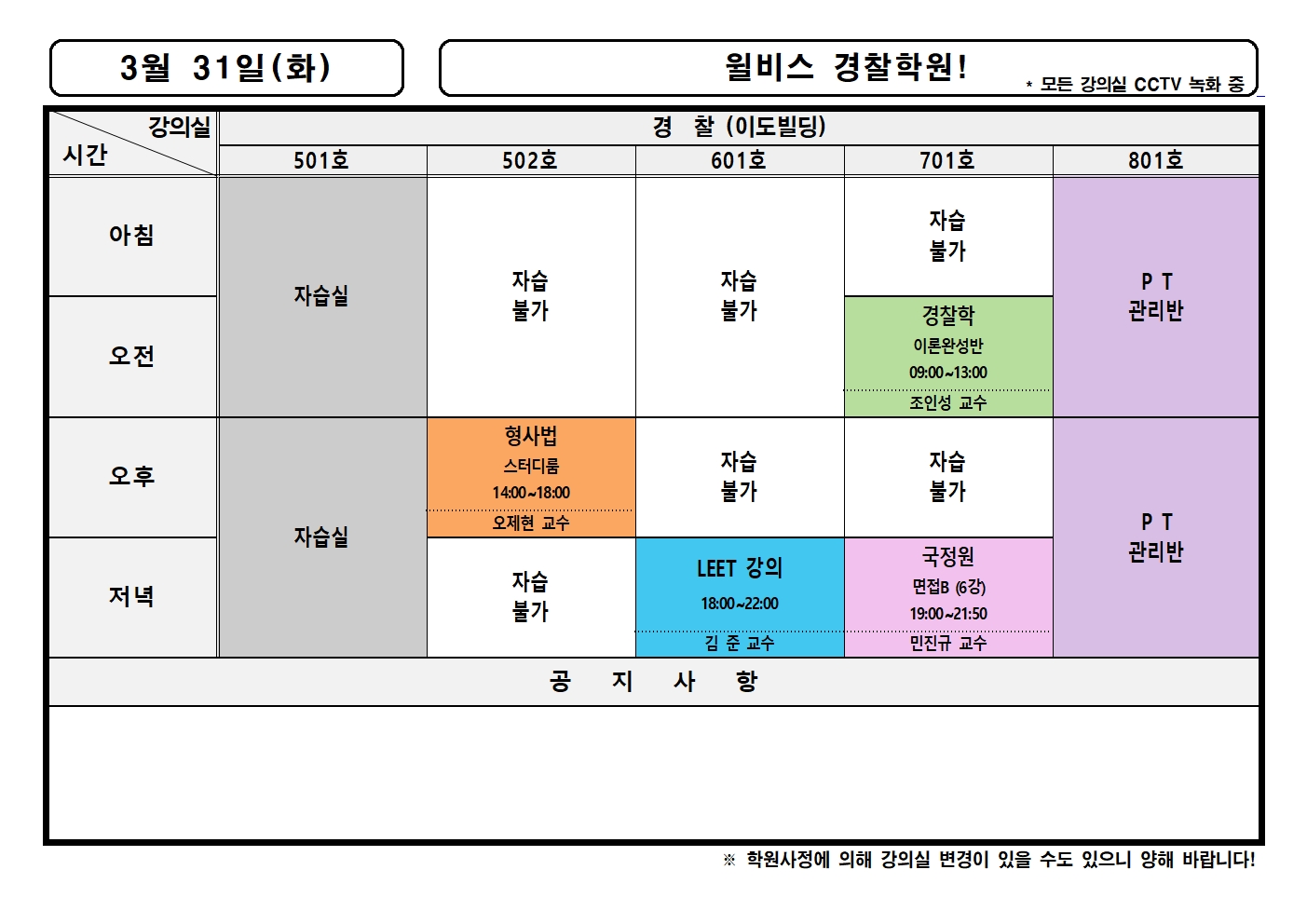 3월 31일(화) 강의실배정표