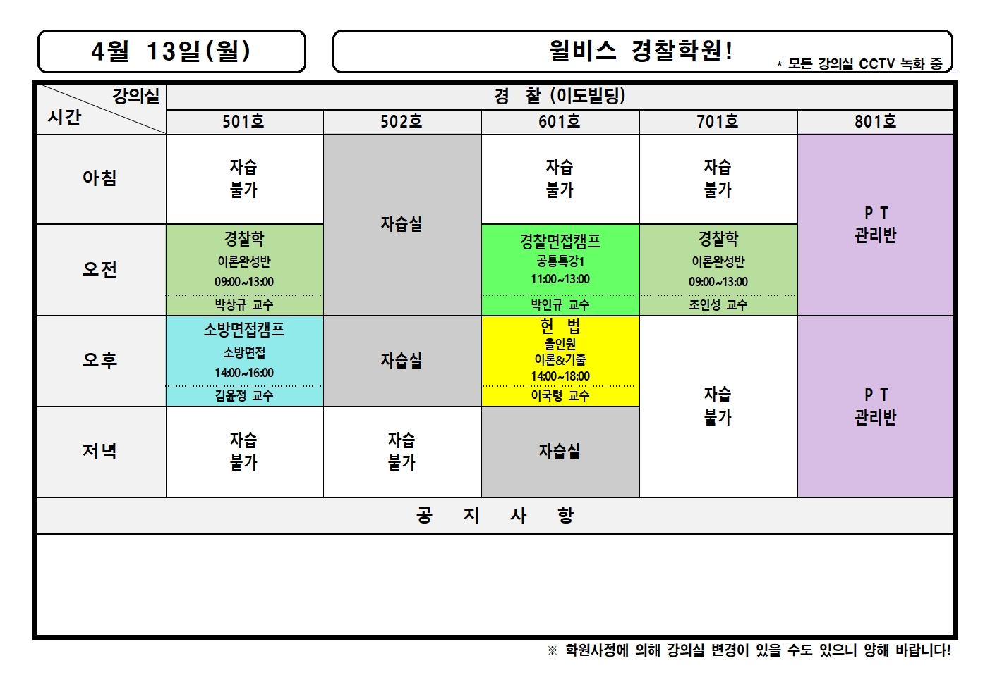 4월 13일(월) 강의실배정표